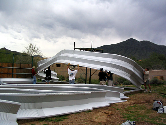 Here's the first set of two hoops being raised as per the instructions. A bunch of guys on the ground are helping while two are behind the scaffolding with rope pulling the hoops into place